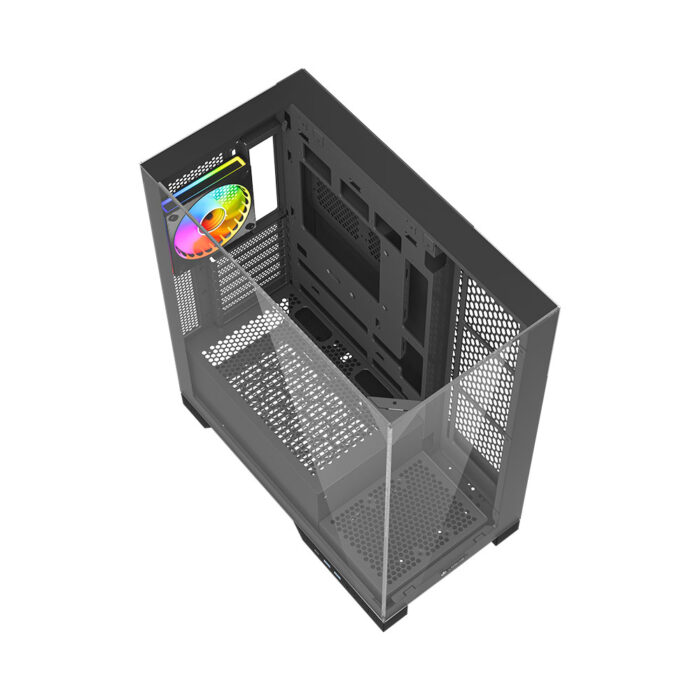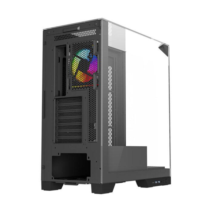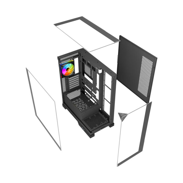 بدنه این کیس از متریال مقاوم و با کیفیت ساخته شده تا در برابر ضربه و فشار مقاومت بالایی داشته باشد. طراحی پنل جلویی به شکلی انجام شده که جریان هوا به بهترین نحو وارد کیس شود و عملکرد خنککنندگی قطعات را به حداکثر برساند. همچنین وجود پنل شفاف کناری، نمایی کامل از قطعات داخلی و نورپردازی RGB سیستم را به نمایش میگذارد.